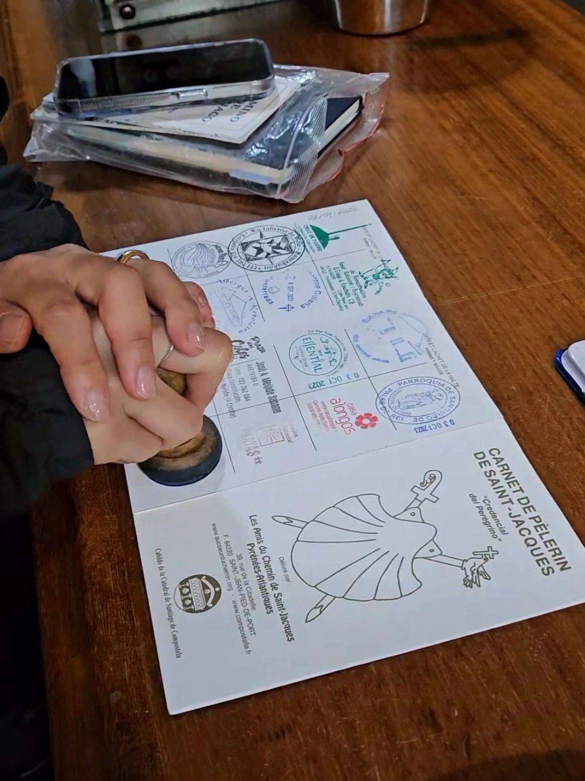 언니는 평소처럼 따뜻한 콜라카오 한잔을 시키고 나는 코르타도를 시켜서 같이 먹었는데 빵 사이즈도 크고 2조각씩 나와 정말 푸짐해서 이걸 다 먹을 수 있으려나 했는데 맛이 일반 빤콘토마테가 아니었다. 빵은 더 두껍고 바삭하고, 토마토는 다른 소스가 들어가지 않으면 낼 수 없는 진한맛이었는데 엄마야... 너무 맛있어서 커다란 빵 두 조각을 각자 싹 비우고 나왔잖아... 이제 스페인 어딜 가도 무서워서 빤콘토마테 못 시키겠다. 여기가 정말 다른 차원으로 맛있었거든. 다른 순례자들이여, 마지막 날 산티아고 입성 전에 여기 한 번 들려주세요. 구글 평은 안 좋던데 아마 서비스가 좀 퉁명해서 그런 것 같다. 하지만 나는 다시 가면 꼭 들를 곳으로 정했다. 10유로 조금 안 되는 가격에 언니와 나 둘이서 맛있는 아침도 먹었고, 여기에서 내 산티아고 순례자 여권의 마지막 빈칸에 도장을 꾹 찍어 가지고 나왔다. 든든한 배, 꽉 찬 순례자 여권. 이제 정말 산티아고 입성의 모든 준비가 완성된 것 같다.