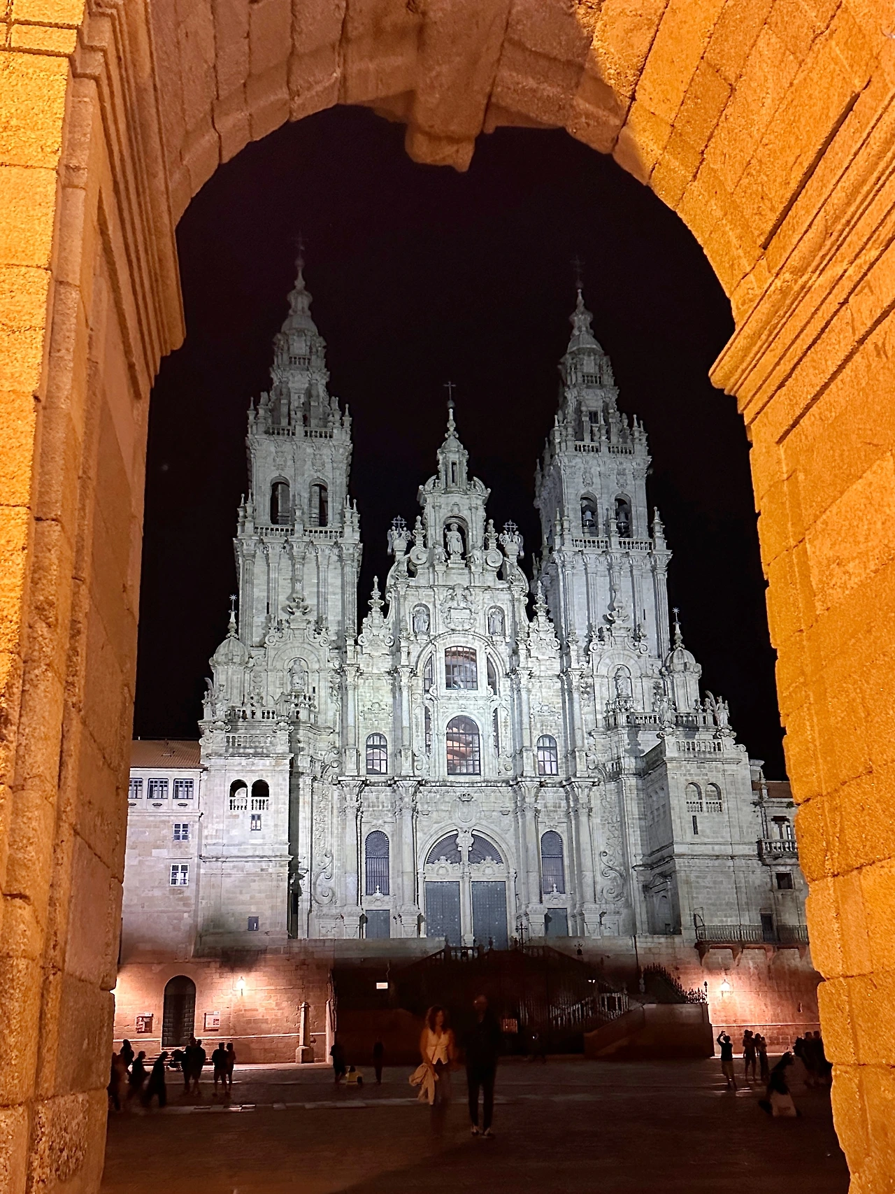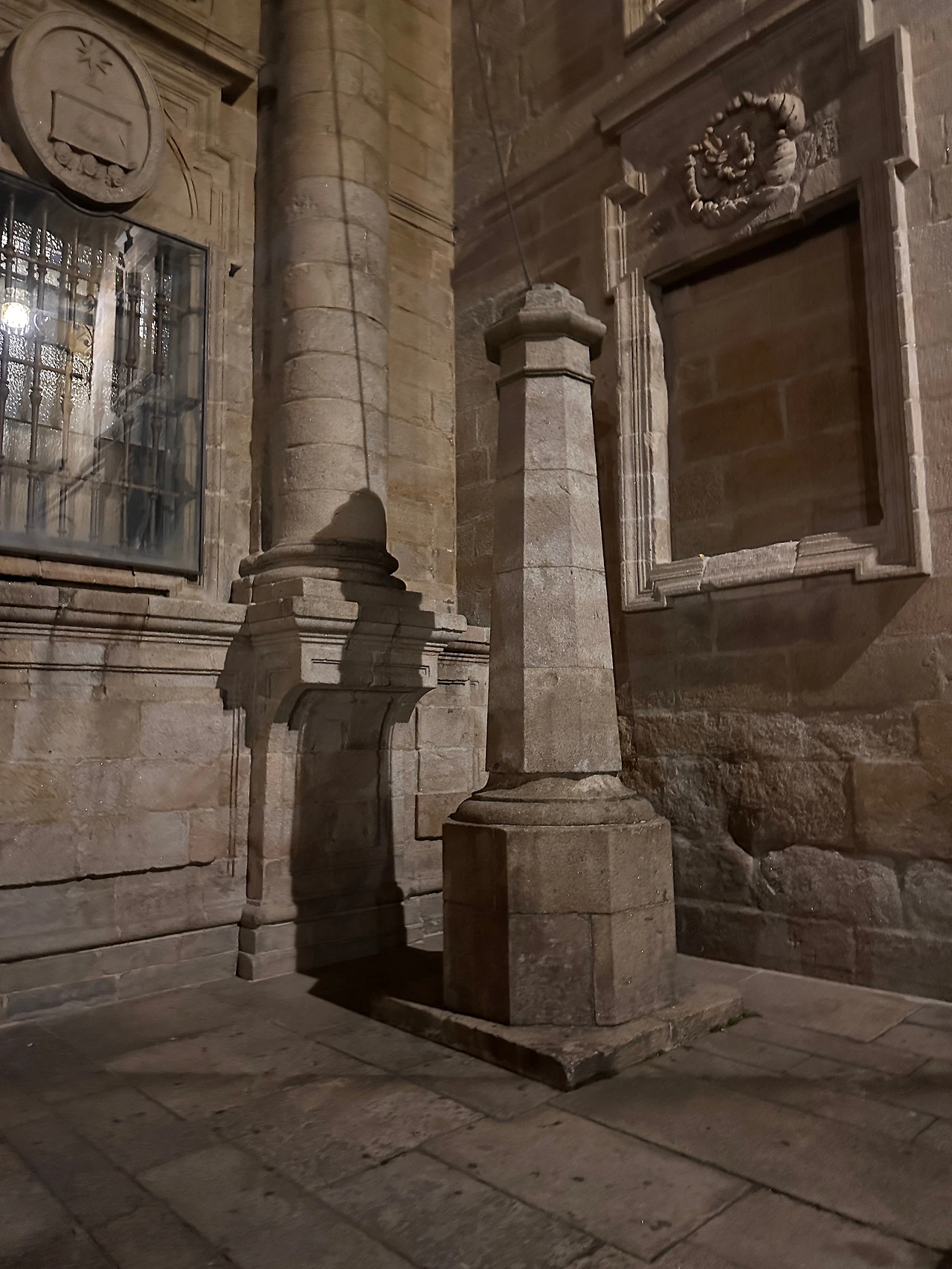 정말 1초 사이에 이게 뭔지 머릿속에 그림이 사사삭 맞춰지는데 바로 언니가 보고 싶었지만 정확한 로케이션을 몰라 못 찾고 있던 '순례자의 그림자'를 볼 수 있는 스팟이었다. 순례자의 그림자는 정말 신기한 게 주위에 아무것도 없는 산티아고 대성당의 구석 한 부분이다. 그런데 저녁에 켜진 조명들 아래로 약간 왼쪽으로 시선을 돌리면 돌기둥이 신기하게 고대 순례자가 지팡이를 들고 있는 그림자를 만들어 낸다. 언니가 너무 보고 싶었던 건데 이렇게 의도치 않게 찾게 된 게 신기했다.