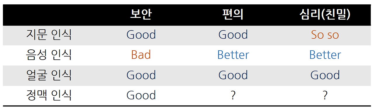 하지만, '삑'하고 찍는 게 아니라, 문을 밀어서 여는 동안 자연스럽게 정맥 인식이 되거나, 운전대를 잡은 순간 자연스럽게 정맥 인식이 되는 등으로 UX 설계에 따라 편의성은 달라질 것입니다. 로봇과 악수를 해서 정맥 인식이 되는 방식이라면 심리적 친밀감 면에서도 더 낫지 않을까요. 이것이 UX 설계의 중요한 이유이고, 앞으로 어떤 어플리케이션이 나올지 모르기 때문에 제가 위의 표를 물음표로 비워 둔 이유입니다.