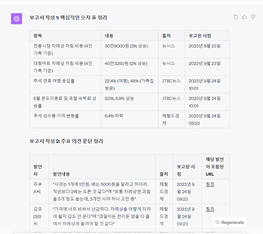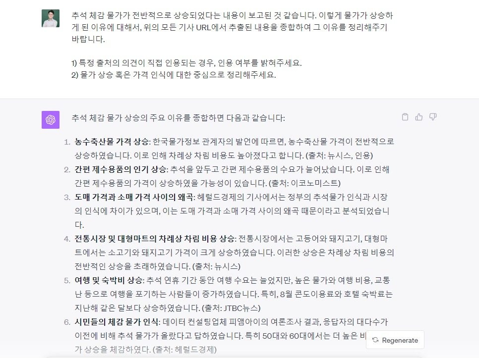 할루시네이션까지는 아니지만 물가 상승 이유는 살짝 목적에서 어긋나는 내용도 포함된 것 같습니다만, ChatGPT에게 100% 모든 일을 맡길 수는 없으니 역시나 작업자가 보고서에 포함시키는 데에 최종적 검수는 해서 완료해야겠죠.