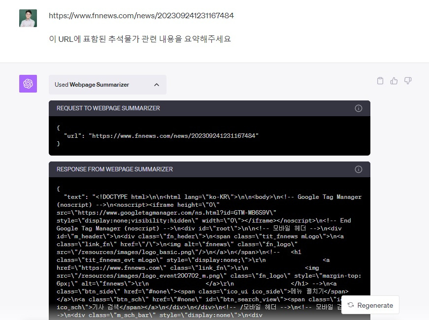 ChatGPT 플러그인 중에 구글 검색 결과 자체를 요약해주는 플러그인도 있는데, 직접 해보니 뉴스나 문서 검색 결과 전체 목록에 접근하지 못해서 상위 3개 정도가 가능할 뿐 검색 결과에 포함된 URL을 전부 딸 수는 없더라고요.