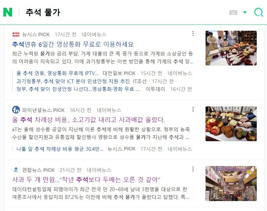오늘의 사례는 '추석 물가'에 대한 리서치로 해보겠습니다. 이 글을 작성하는 시점이 마침 추석 연휴 직전이거든요. 추석 물가가 높아졌다거나 낮아졌다거나, 그에 대한 사람들의 반응이 어떻다거나, 전체적인 내용을 조사해보겠습니다.