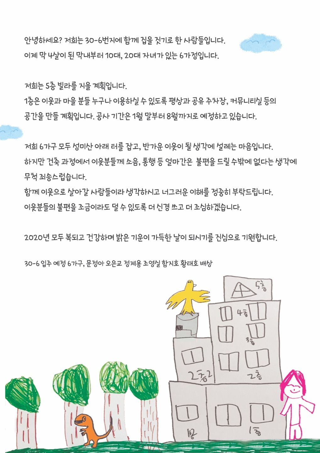 또래보다 적은 무게의 다섯 살짜리 아이가 발을 끌면서 소리 나지 않게 다니는 법을 먼저 배우고, 뭐 하나 떨어트릴 때마다 주의를 주기도 전에 '미안 미안'이라고 말하는 집. 오래 살고 싶지 않았다. 마음을 나눌 수 있는 이웃이 필요했다. 그래서 집을 짓기 시작했다. 그리고 자금을 마련하면서, 의견을 조율하면서, 때론 힘들고 지치기도 했지만 아이의 발걸음을 생각하며 후회하지 않으려고 했다. 요즘처럼 바깥으로 나가지 못하고 집에 있는 시간이 많아진 때 "엄마 새집에 가면 쿵쾅쿵쾅 춤춰도 된다고 했지?" 말하는 아이를 보며 더할 나위 없이 기뻤다.