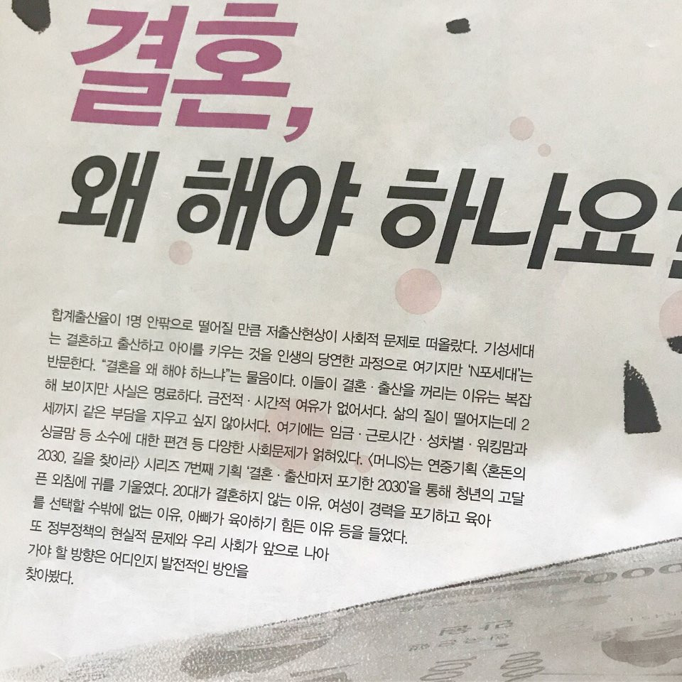 5. 한 경제 주간지의 연중기획 <혼돈의 2030, 길을 찾아라>의 7번째 기획 시리즈 ‘결혼·출산마저 포기한 2030’에 인터뷰이로 참여했다. 마지막 꼭지 기사다. 나서고 싶어 한 것은 아니었지만, 결론적으로는 모자라는 지면 분량 만큼 할 말이 넘쳐나 아쉬운 인터뷰. 이런 말들이 모아져 아이 기르고 더불어 살기 좋은 세상을 만드는데 보탬이 된다면 백 마디도 더하겠다. 그러나 예상한대로 반응은 “헬조선에서 애랑 잘 살아봐라”거나 “지들이 낳아놓고 징징 좀 대지마”라거나. ㅋㅋ 정말 다 같이 행복하게 살면 좋겠다. 쫌! ~~