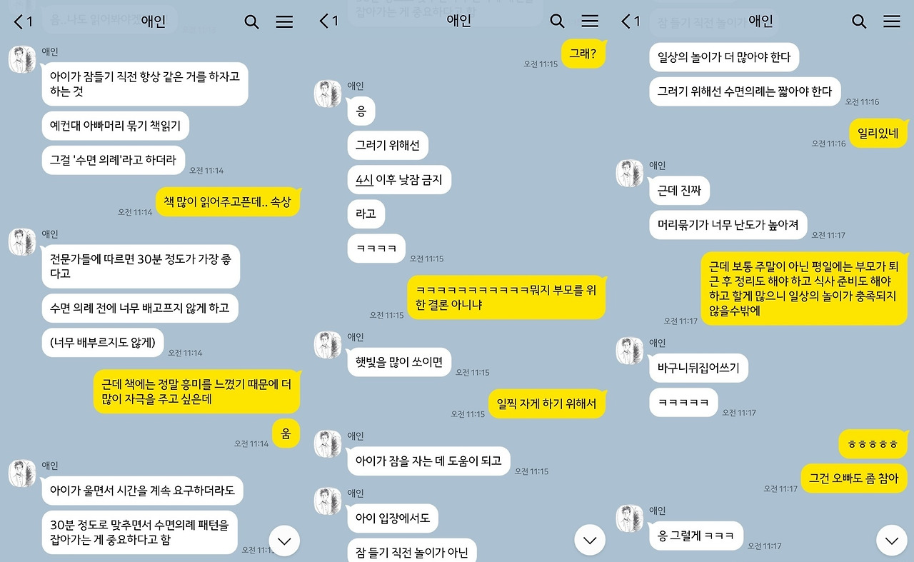 아이가 잠들기 직전 항상 같은 걸 하자고 하는 것을 '수면 의례'라고 한단다. 전문가들에 따르면(어떤 전문가인지는 모르겠다. 나는 육아서를 제대로 읽은 경험이 없다) 수면 의례는 30분 정도가 가장 좋다고, 매일 일정한 시간을 유지하고 아이와 약속하는 것이 좋다고 한다.