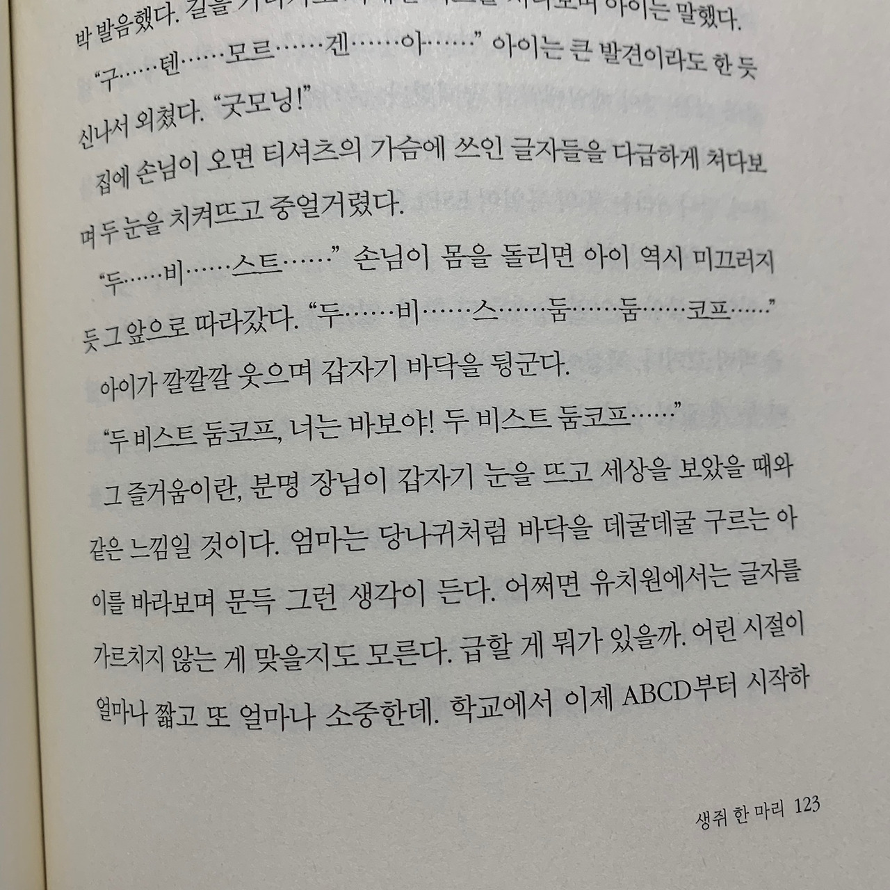 아마도 아이의 책, 그러니까 이야기에 대한 단순한 호기심이 배움에 대한 흥미로 바뀔 때 - 머잖은 일이라고 생각해 두렵다 - 지금보다 더 복잡해질 거다. 특히 7세까지 통합보육을 하는 공동육아 방식, 그러니까 취학 전 단계에서 일종의 대안교육을 선택한 우리 부부에게는 대한민국 부모라면 절대 피해 갈 수 없을 '사교육' 앞에서 고민하는 시간이 어쩌면 더 빨리 올 지 모른다.