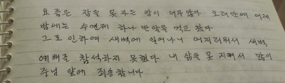 할머니를 보내고 원효로 할머니 집으로 돌아와 할머니 침대에서 엄마와 누워 잤다. 저녁이 다 돼 깼다. 집으로 가서 옷가지를 챙기고 맡겼던 병원서 하루를 찾아 다시 원효로로 돌아왔다. 엄마는 여전히 자고 있다. 하성이와 하루를 산책시키러 나갔다. 들어와 하루를 씻기고 나도 씻고 누웠다. 엄마는 계속 잔다.