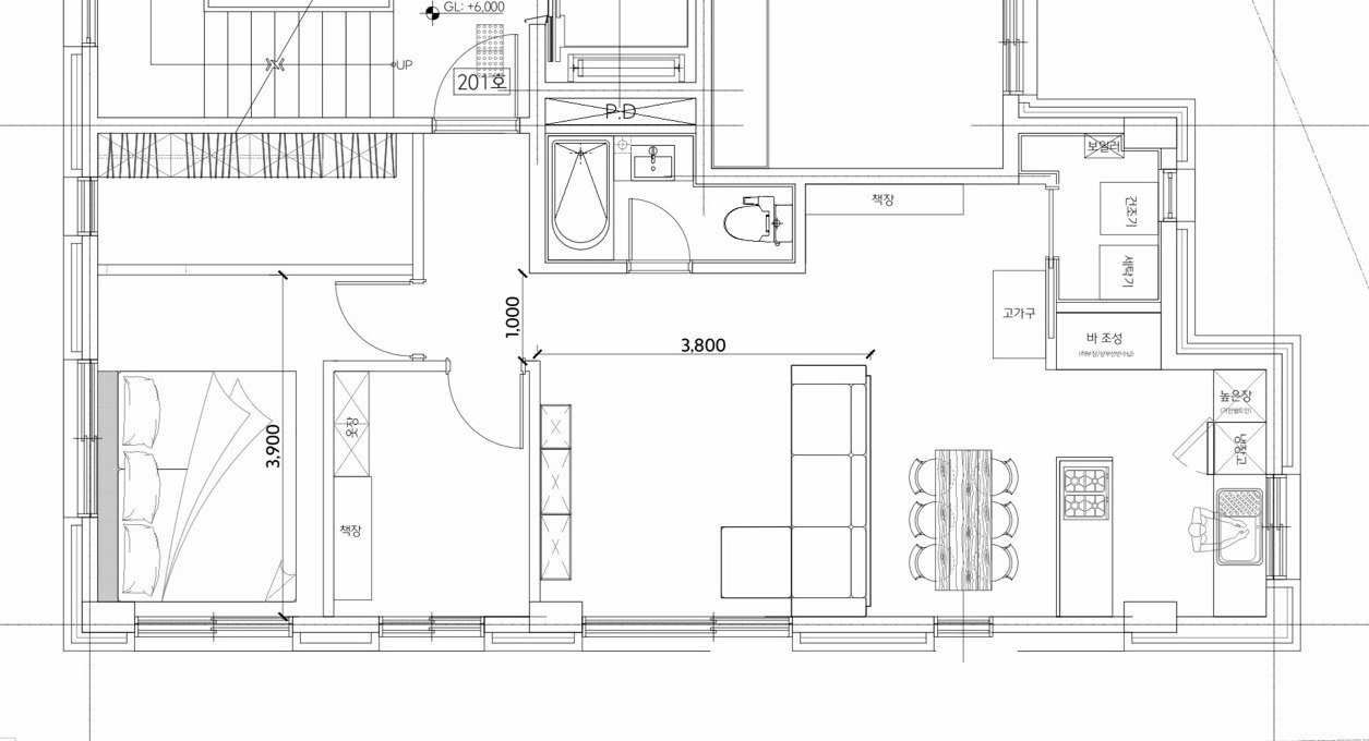 이전 구조가 '다소 골방형'이라는 이일훈 선생님의 코멘트가 머릿 속을 떠나지 않았다. 아트월로 활용하려는 복도 공간을 포기할 수 없겠다고 했지만, 도면을 볼 수록 "복도가 그냥 죽어버리는 공간이 될 수도 있겠다" "좁은 집이 더 좁아보일 수도 있겠다"는 생각이 계속 맴돌았다. 그래서 주방과 거실을 동쪽으로 배치하고, 복도를 이와 연결되는 개방된 구조로 변경했다.