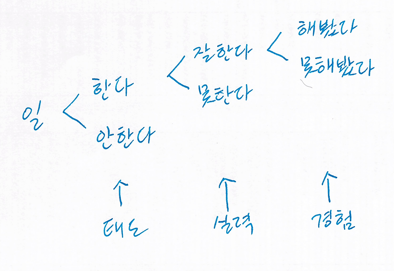예전에 PCG 여준영 대표의 블로그에서 일에 대해서 설명하는 포스트를 본 기억이 있습니다. 아래 그림과 같이 설명을 해주었는데요. 수식으로 표현하자면 '일 = 태도 + 실력 + 경험'이라고 할 수 있습니다. 현재 하는 일에서 성과를 내기 위해서 필요한 것이 태도, 실력, 경험이라고 생각합니다.