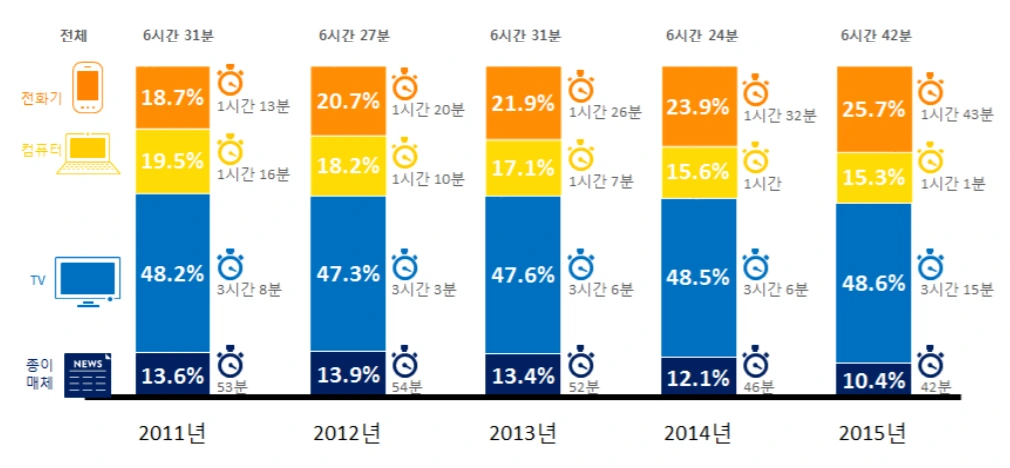 앞서 2에서 '온라인 미디어 이용시간이 꾸준히 성장하고 있다' 고 언급했었는데요, 자료를 좀 더 정확히 살펴보면 컴퓨터 이용 비중은 줄어들고 스마트폰 사용 비중이 그 이상으로 높아지는 중임을 알 수 있습니다. 저만 해도 요즘은 회사에서 업무를 처리하거나 지금처럼 브런치에 글을 올릴 때 빼고는 컴퓨터를 쓸 일이 없습니다. 출퇴근길 지하철에서나 자기 전 이불 속에선 스마트폰을 사용하죠. 그 말인즉슨, 콘텐츠를 소비할 때 가장 많이 사용하는 건 스마트폰이라는 사실. 그럼 스마트폰으로는 주로 어떤 콘텐츠를 소비할까요?