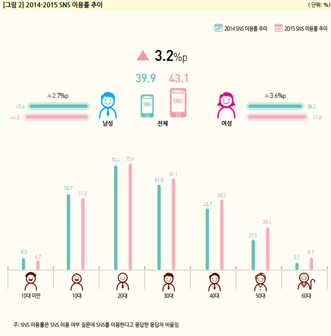 2015년 기준, 우리나라 국민의 43.1%가 SNS를 사용한다는 통계가 있습니다. 2014년보다 3.2% 증가한 수치입니다. 그들이 SNS에 소비하는 시간은 하루 65.1분, 이 또한 1년 전에 비해 5.3분 늘어났습니다. 미디어 기기별 SNS 이용량은 스마트폰이 57.7분으로 압도적이었는데요, 지금의 추이를 지켜보았을 때 앞으로도 스마트폰으로 SNS를 사용하는 사람들과 그들의 SNS 이용시간은 계속해서 증가할 것으로 보입니다.