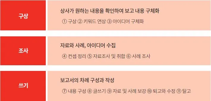 글을 쓰는 과정을 알고 있음에도 불구하고 보고서를 써야 하는 상황이 되면 구상과 조사 없이 일단 쓰기 시작한다. 시간의 흐름에 따라 쓰고 사건이 어떻게 시작되었는지부터 설명한다. 작성자가 지켜본 대로, 작성자가 실행한 대로 보고서를 쓴다. 보고서를 무작정 쓰기 시작하면 전달하고 싶은 핵심 메시지도 없고 의견과 주장의 구분도 모호해진다. 시간 순으로 쓰거나 사건의 시작부터 전개되는 과정을 한참 늘어놓고 맨 마지막에 문제점과 해결방안을 쓰면 결론까지 읽기도 전에 상사는 다시 써오라는 말을 할 것이다.
