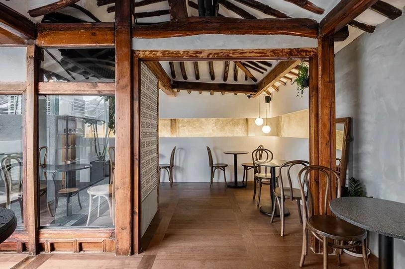 위의 이미지는 한국적인 카페라고 했을 때 머릿속에 그려지는 공간이다. 한옥을 상징하는 대들보와 서까래가 중심을 잡고 현대적인 마감재 (Ex. 타일, 유리 등)와 가구들이 그 공간을 채운다. 한국 전통을 주제로 디자인했지만 두 공간의 느낌은 전혀 다르다. 과연 무엇이, 왜 다른 걸까? 필자는 이렇게 생각한다.