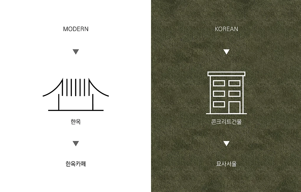 왼쪽은 전통을 풀 때 가장 많이 사용하는 방식으로, 한옥이라는 그릇(공간)에 현대적인 재료(Ex. 조명, 가구, 마감재 등)를 넣어 만든다.