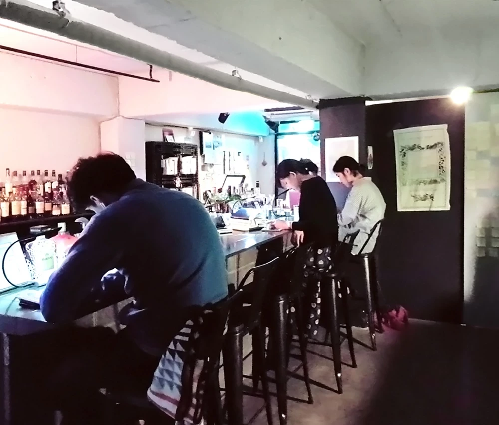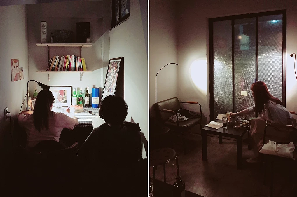 실제로 가게의 좌석도 혼술&혼책러들을 위해 설계되었는데, 우선 술과 음료를 제조하는 작업대에는 바 테이블 의자를 두어 한 명씩만 앉을 수 있게 했다. 바 체어는 *톨릭스 체어인데, 허리를 기댈 수 있도록 등받이가 달린 가구를 사용했다.