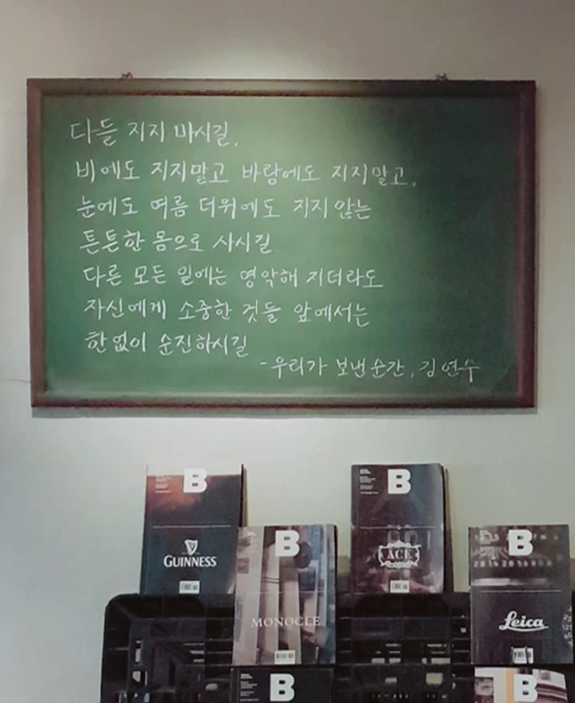 보통의 메뉴판도 콘셉트를 녹이면 이렇듯 새로울 수 있다. 이 곳 책바에 걸맞은 감성적인 메뉴 보드였다.