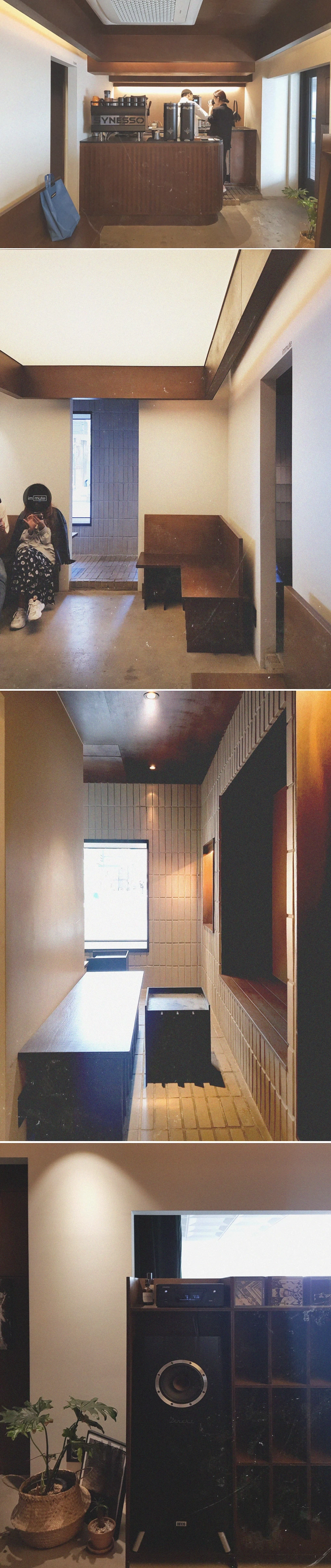 안쪽 좌석에는 자리자리마다 아래 같은 직사각형 낮은 테이블이 배치되어 있는데, 제작가 구이다. MDF를 하나씩 켜서 붙이고 검은색 도장으로 마감한 테이블의 디자인이 마음에 들었다.