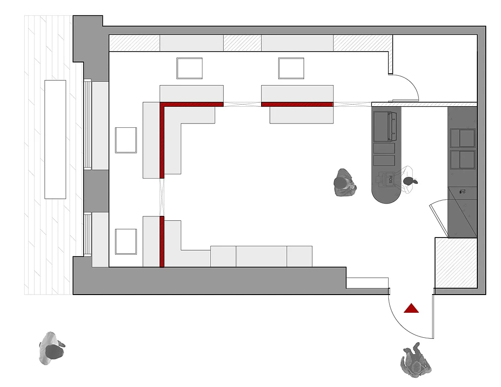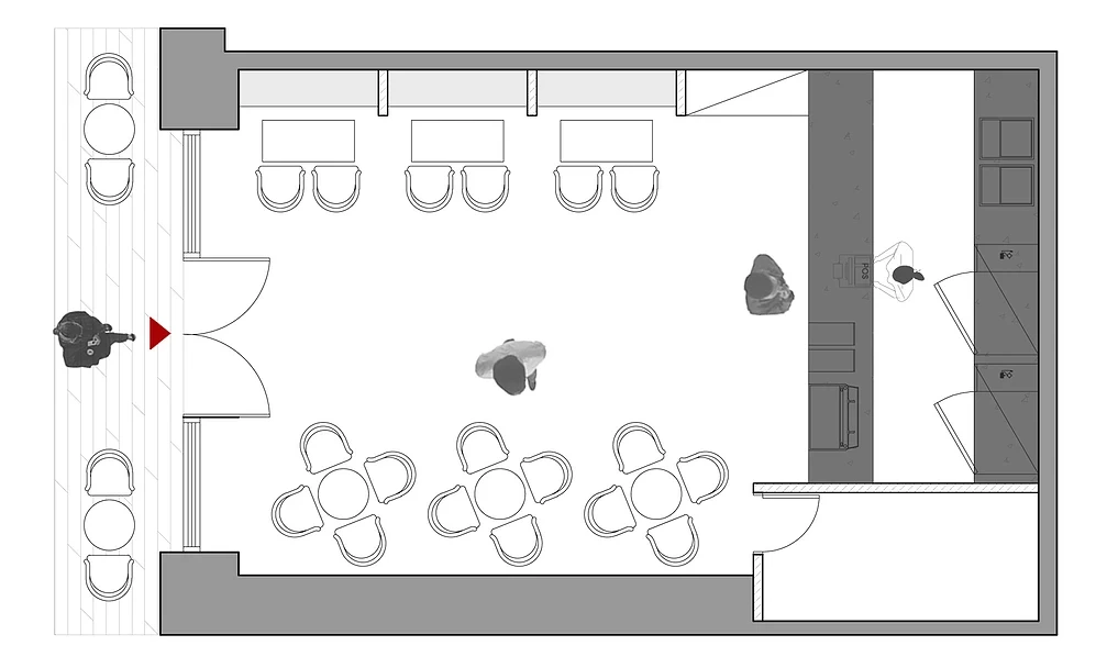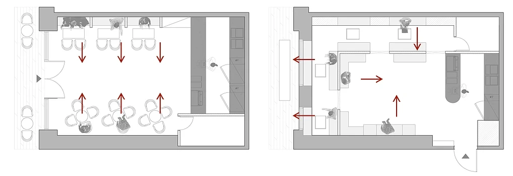 일반적인 평면은 그림처럼 사람의 이동이 가장 많은 길가면에 입구를 만든다. 벽을 따라서 좌석을 배치하고, 공간을 한눈에 볼 수 있도록 직원이 서 있는 작업대는 입구 맞은편에 배치한다.