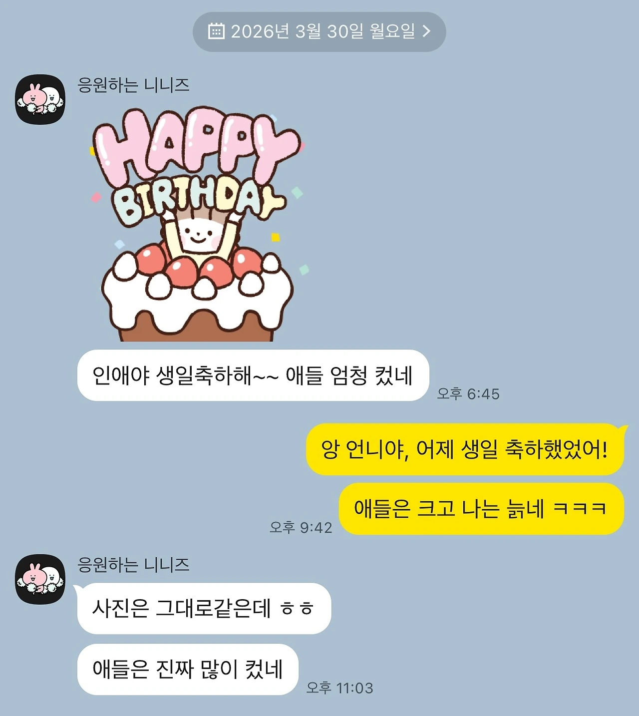 언니와의 인연이 또 하나 있는데 생일이 엇비슷하다는 것이다. 언니가 하루 먼저 생일이고 그 다음 날이 내 생일이다. 매해 생일 즈음에 인사라도 나누는데 휴직 들어오고는 그 인사마저도 깜빡했다. 3월은 아이들이 새학년에 적응하는 시기이기에 몇 배로 더 바쁘게 일상이 돌아갔다. 휴직하던 해에 둘째가 초등학교를 입학했고, 그 다음 해는 막내가 입학했다. 올해는 총회며 참관 수업이 더 이른 시기에 진행된 덕분에 더 정신이 없었던 거 같다. 그런데 오랜만에 언니의 반가운 인사! 그냥 지나칠 수 없다. 바로 언니와 약속을 잡았다.