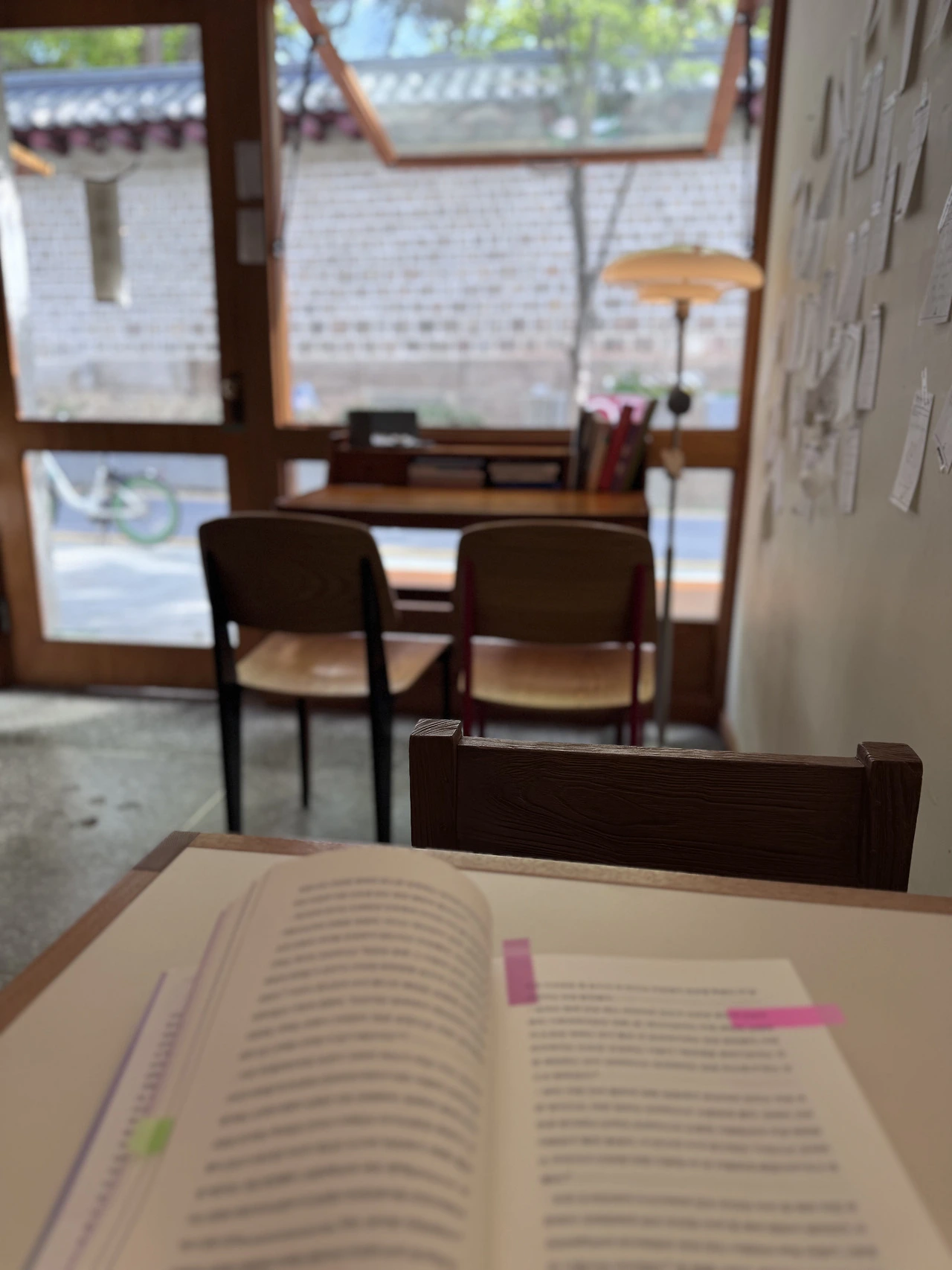 마침 언니가 휴가 일정이 있어 언니와 집중해서 놀기 위해 바로 다음 날 있을 수학교육 강연 자료도 일찌감치 만들어두고 아침 일찍 집을 나섰다. 익선동에서 만나기로 해서 인근의 북 카페에서 두어 시간 보내고 갈 생각으로 책을 들고 갔는데 이른 시간에 연 카페가 많이 없어서 선택지가 많지 않았다. 간판도 없어서 찾기가 쉽지 않았는데 낭낭하게 인사해 주신 사장님 (맞겠지?) 덕분에 간판이 없어 지나칠 뻔 했다고 웃으며 대화를 건넸다.