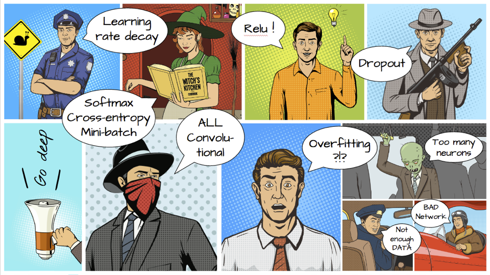 위의 이미지는 Martin Görner라는 사람이 설명한 tensorflow를 이용한 딥러닝 강좌에서 활용된 자료입니다. 링크도 걸어두었으니 관심 있으신 분들은 시간 되실 때 강좌도 함께 들어보면 좋을 것 같습니다.