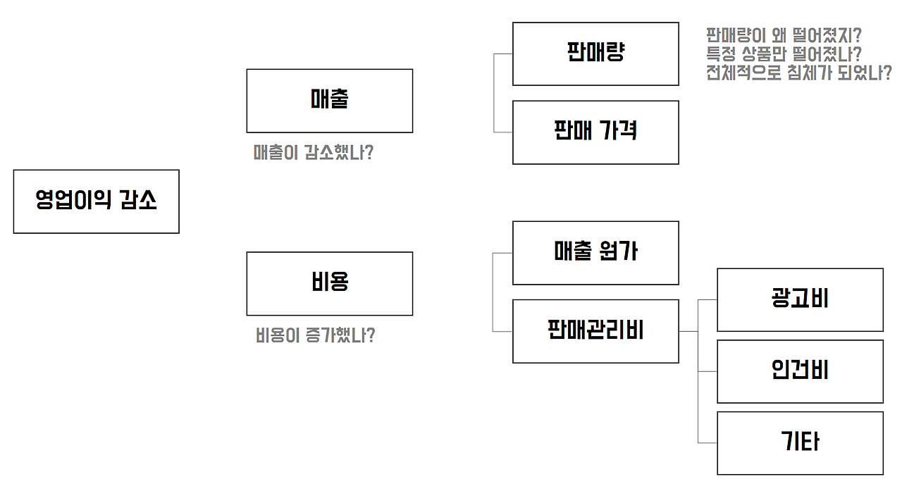 지난주 우리 회사 영업 이익이 20% 하락했다고 생각해봅시다. 이 하락의 원인을 찾기 위해서 우리는 영업 이익을 구성하는 매출과 비용을 나누어 관찰하겠지요. 매출이 하락해서 발생한 하락인지, 비용이 상승해서 발생한 하락인지 구분하는 것입니다. 더 세부적으로 확인한다면 매출을 구성하는 요소, 비용을 구성하는 요소까지 확인하여 데이터 분석을 진행합니다. 이렇게 구조를 그려서 분석 가지를 차근차근 전개해나가고, 필요 없는 가지, 필요 있는 가지를 걷어내면서 내가 원래 찾고자 했던 목적의 원인을 탐색해 나갑니다. 이것을 구조적 사고법이라 합니다.