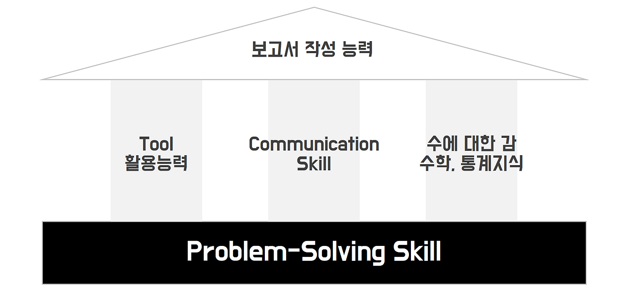가장 아래에 위치한 문제 해결 능력을 기반으로 세 기둥(Tool 활용능력, Communication Skill, 수에 대한 감)이 있어야 하고 거기에 전달력 있는 보고서 작성 능력까지 갖춰진다면 훌륭한 분석가라고 생각합니다. 문제 해결 능력이 토대가 되는 이유는 기둥을 이루는 구성, 지붕의 구성 모두 문제 해결 능력을 기반으로 기술이 다듬어지고 발전합니다.