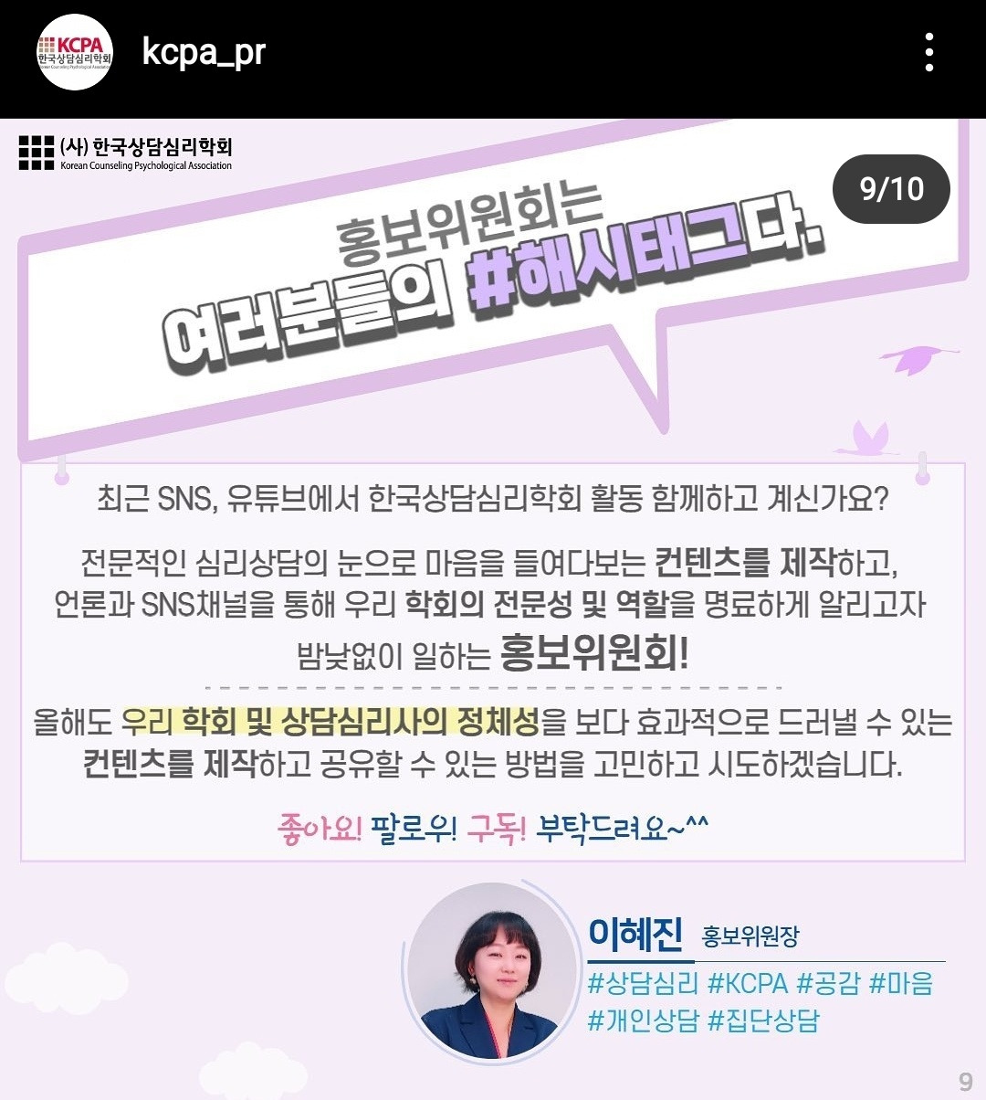 홍보위원회 구성원은 20대 후반의 상담 수련생부터 50대 초반의 위원들까지 다양한 연령대, 다양한 성격, 다양한 배경으로 뭉쳐있다. 신기한 건 우리 모두 '상담자'라는 점이다. 상담자 10명이 모여, 홍보 콘텐츠를 기획하고 고민하고 만들어낸다. 참 새로운 경험이다. 언제 이런 경험을 해볼까 싶어 1년 봉사직이지만 최선을 다하게 된다. 그렇게 10명의 헌신으로 한 땀 한 땀 만들어가고 있는 우리 학회 홍보 콘텐츠!