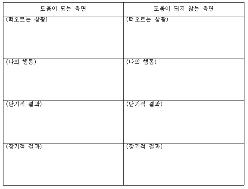 - 그리고 생각해보자. 내가 현재 그 사람의 눈치를 보는 것이 그 사람과의 친밀감 유지에 도움이 되고 있는 측면과 도움이 되지 않는 측면은 무엇인지 구분해보자.