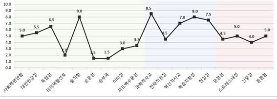 다음의 성격 프로파일을 가진 사람은 리더역할선호, 순응성, 승부욕의 약점이 지속적으로 발목을 잡을 것이다. 리더역할이 맡겨지는 것을 피곤해하고, 순응을 강요하는 것도 싫어하지만, 굳이 경쟁하거나 싸워서 이길 마음도 없는 낮은 승부욕을 갖고 있다. 이러한 프로파일의 경우, 자신이 가진 강점인 높은 독립성과 높은 과학적사고, 높은 학습지향성을 활용하여 독자적으로 전문성을 발휘할 수 있는 영역에서 스스로 학습해서 일한다면 더 편안한 마음으로 성과를 낼 수 있을 것이다.