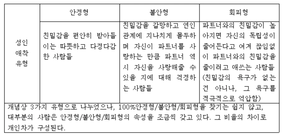 부모-아이 관계에서 나타나는 애착모양은 성인의 연인관계에서도 성인애착모양으로 나타납니다. 불안형의 아빠와 회피형의 엄마를 보고 자란 저는 그 희귀하다는 인구의 5%인 복합형(불안+회피)에 해당했습니다. 세상에 안정형의 사람이 존재한다는 것조차 알지 못했습니다. 아니, 생각해보면 안정형의 사람들이 나에게 잘해주고 다가오면 지루하고 재미없다고 느꼈습니다. 그래서 적극적으로 밀어내고 거절했습니다. 따뜻하고 다정다감한 사람은 왠지 모르게 부담스러웠습니다. ‘나에게 왜 이렇게 잘해주지?’ 의심이 들었습니다. 나에게 잘해줄 이유가 없는데 잘해주는 것 같은 느낌, 나의 외모만을 보고 스킨십을 위해 다가오는 느낌이 들었습니다. 대신에 나의 불안을 일으키는 사람들(불안형과 회피형)을 만나면 이것이 사랑이라고 착각했습니다. 나를 사랑한다는 이유로 나에게 집착하고 구속하는 불안형을 만나면, 이 사람이 진짜 나를 사랑해서 이러는구나라고 생각했습니다. 가까워졌다 싶으면 잠수를 타버리는 회피형을 만날 때면, 내가 더 노력하면 다시 돌아올거라고 착각하며 몇 년 동안 만남과 이별을 반복하던 연애도 진짜 사랑이라 여겼습니다.
