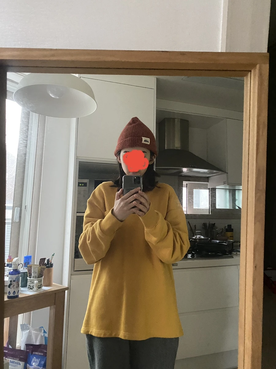 누가 봐도 남편 옷을 훔쳐 입은 느낌이 든다... 아래 쭈리가 없는 디자인인 데다가 맨투맨 답지 않게 볼륨이 없고 빳빳하다고 해야 하나. 남편이 왜 이 옷을 입지 않았는지 알 것 같았다. 더군다나 나에겐 사이즈까지 맞지 않아 내가 이 옷을 입고 밖에 나갈 일은 없겠다는 결론이 들었다.