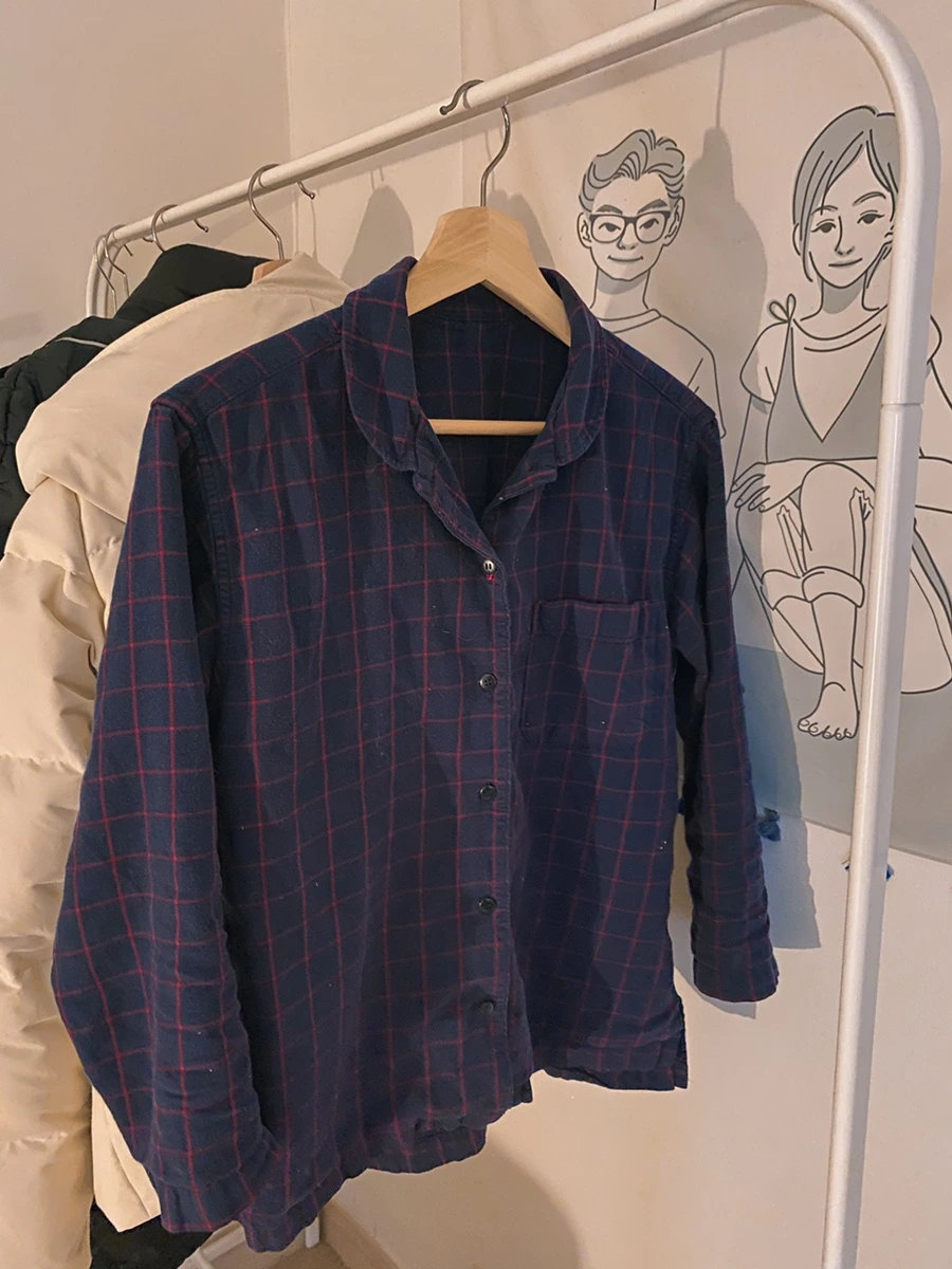 샤워를 하고 나서는 여름을 제외한 모든 계절에 입는 플란넬 잠옷으로 갈아입어준다. (너무 생활감이 있는 주름샷... 이해해주세요) 나는 꽤나 뜨거운 물로 샤워를 하는 것을 즐기기 때문에 샤워를 하고나면 체온이 꽤 올라간다. 그 때문에 보일러를 아예 꺼버리지 않는 이상, 샤워 후에 수면잠옷을 입으면 굉장히 덥고 답답하다. 때문에 이 적당한 두께의 플란넬 잠옷을 입고 봄가을용 차렵이불이 깔려 있는 침대 속으로 들어가면 (전기 장판이 있었을 떄의 후끈함은 기대할 수는 없지만) 점차 내 체온으로 나에게 딱 맞는 숙면온도가 설정이 된다.