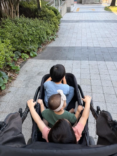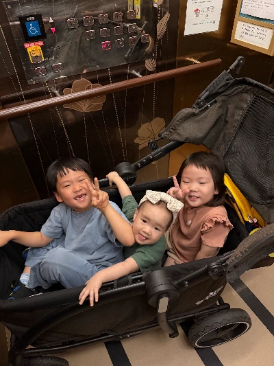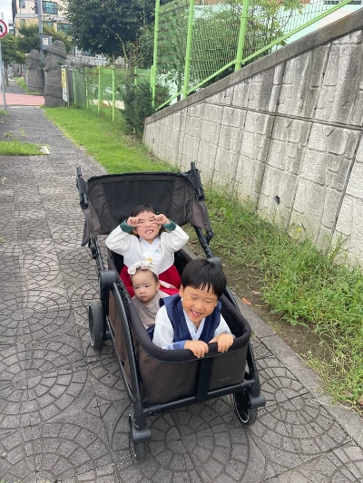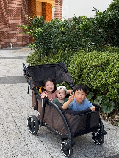 웨건 타고 가는 길에 꽃도 보고, 빵집도 보고, 곤충도 보고, 구름도 본다. 재잘거리며 걷다 보면 어느새 어린이집에 도착한다. 셋 중 둘을 꺼내 어린이집 현관 앞에 내려놓고 서둘러 빠져나온다. 전쟁 1부는 일단 이렇게 일단락.