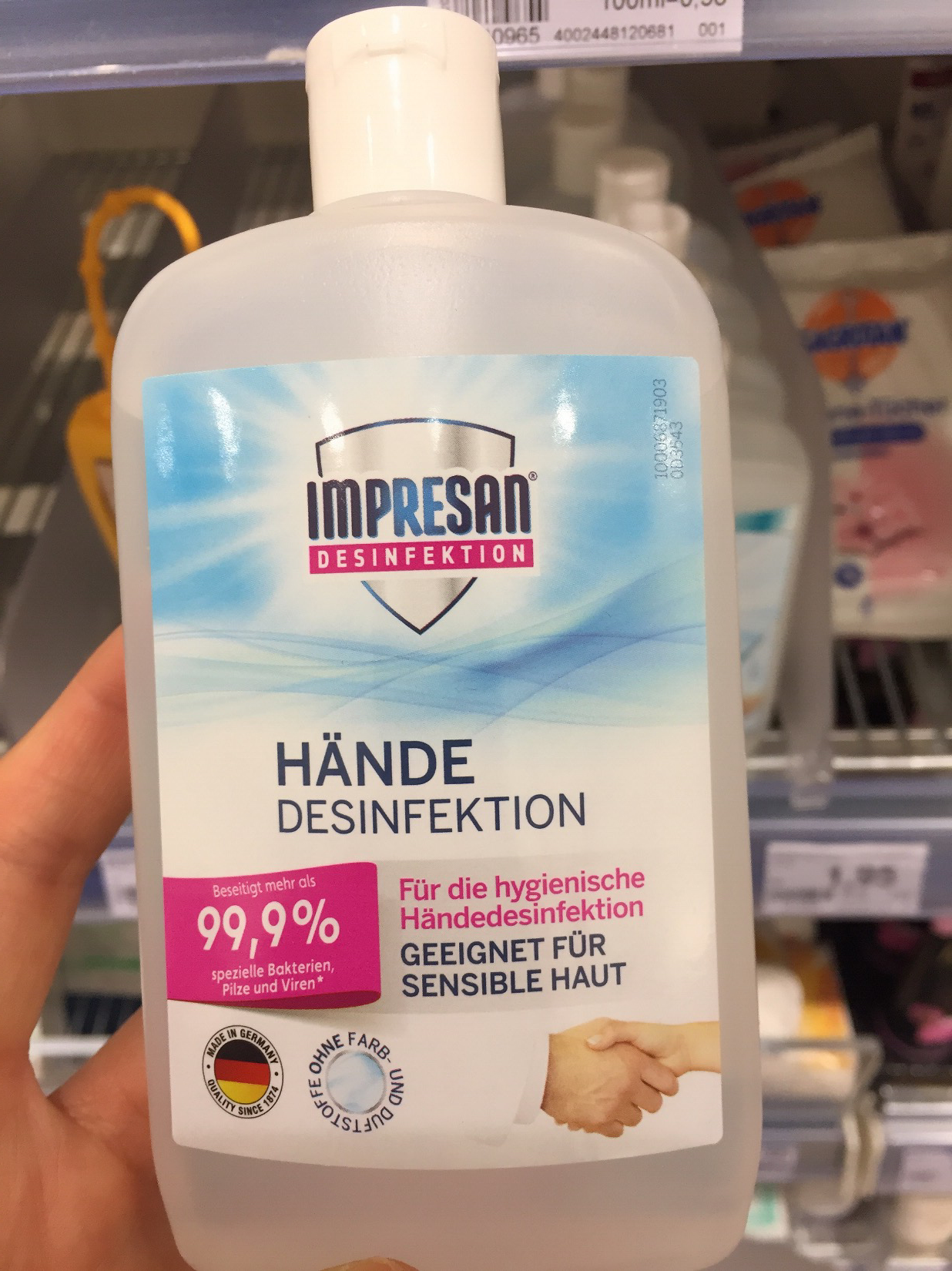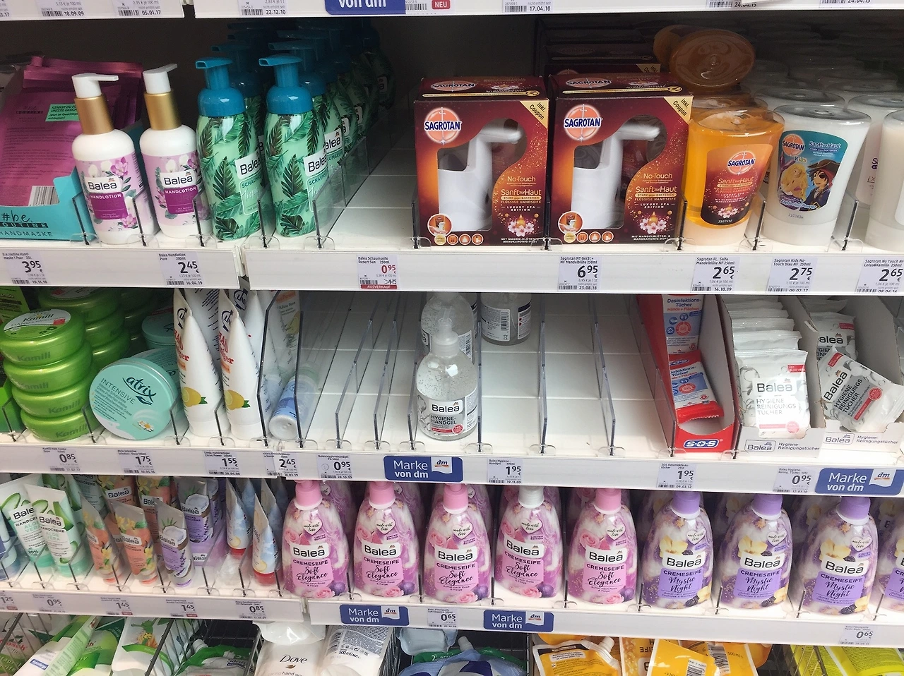 내가 살고 있는 동독지역은 바이에른과 꽤 거리가 있어서인지 조용한 분위기다. 마스크를 쓴 사람은 한 번도 못 봤다. 미세먼지 등으로 인해서 평소에도 마스크를 쓰는 게 어색하지 않은 한국과 달리 독일의 경우 진짜 심각하게 아프거나 바이러스 전파 위험이 있는 사람만이 마스크를 쓰기 때문이다. 마스크를 쓸 정도면 아예 밖에 돌아다니지를 않아야 한다. 공항 등은 예외겠지만 거리에서 마스크를 쓴 사람은 보이지 않는다. 오히려 마스크를 쓰면 더 오해받을 가능성이 크다. 그렇지만 드럭스토어와 약국에 판매하는 손세정제는 거의 매진이었고 찾기가 힘들었다. 이렇게 텅텅 비어 있는 모습은 처음이다.