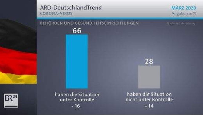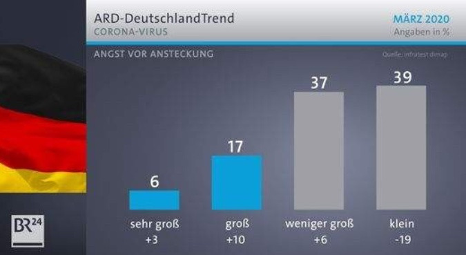 그렇지만 독일 공영방송인 ARD 조사에 따르면 독일 국민 39%가 코로나 바이러스가 두렵지 않다고 했고, 37%는 약간 걱정된다고 했다. 그러니까 76%는 크게 걱정하지 않는 셈이다.