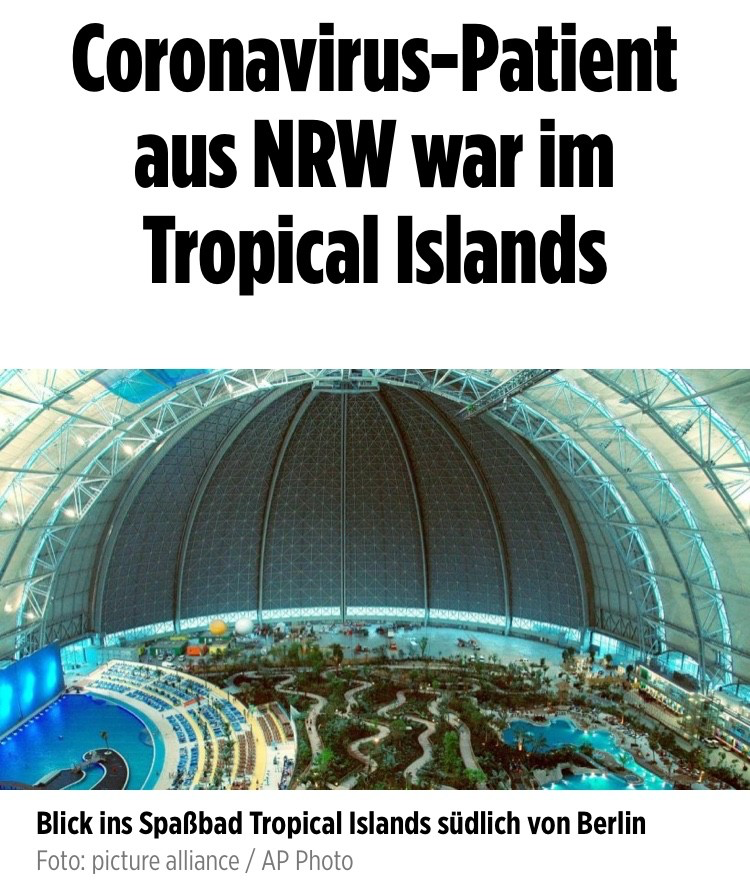 개인적으로 가장 황당했던 것은 베를린에서 가장 큰 수영장인 트로피컬 아일랜드에도 확진자가 다녀갔다. 이곳 일일 방문자가 4-5천명이다. 한국이었다면 바로 하루 이상 문을 닫고 소독을 했겠지만.. 계속해서 운영을 하고 있으며, 확진자의 진술에 의한 접촉자 직원 100여 명만 검사를 했다.
