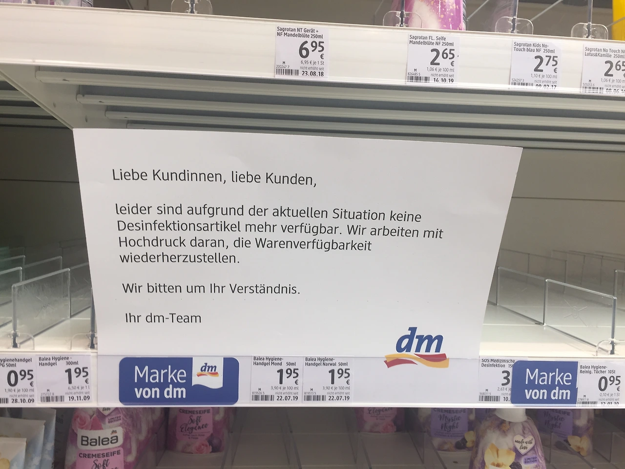 독일 정부는 손 씻기를 강조하고, 악수 및 포옹을 금지했다. 드럭스토어에서는 사재기를 막고자 1인당 3개 등의 제한 조치를 가하고 있지만 이제는 없어서 이조차도 살 수가 없다. 약국과 드럭스토어의 손 세정제는 거의 품절이다.