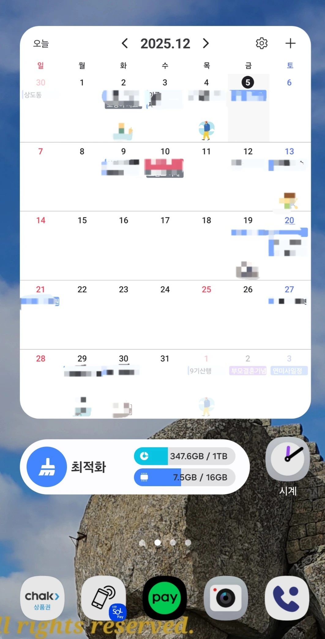 캘린더 위젯 하단에 스마트폰 최적화 위젯을 배치하여 전체 캘린더를 볼 때마다 빗자루 아이콘을 한번씩 터치만 해주면 스마트폰 메모리를 쾌적한 상태로 유지할 수 있다.