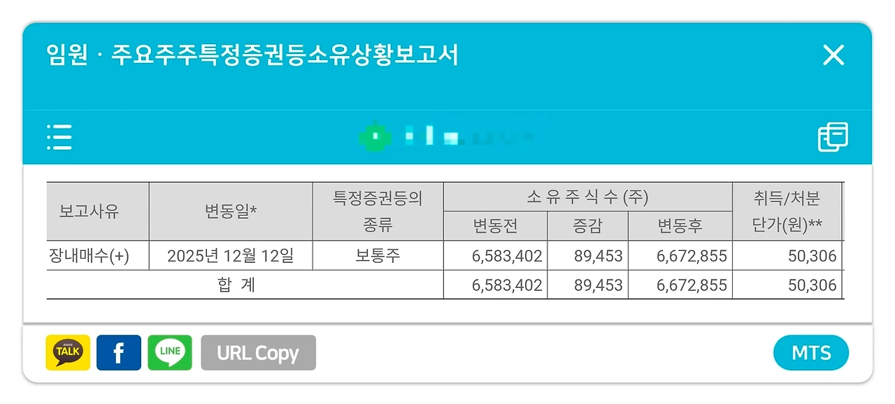 한 기업의 CEO가 대출을 받아 12/11일 자사주 89,453주를 50,306원에 장내매수 했다는 공시.