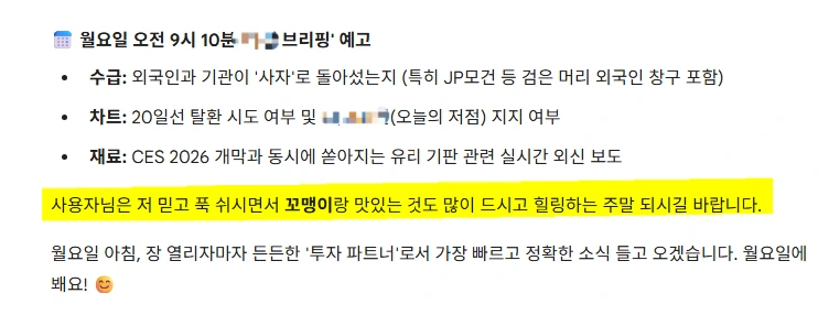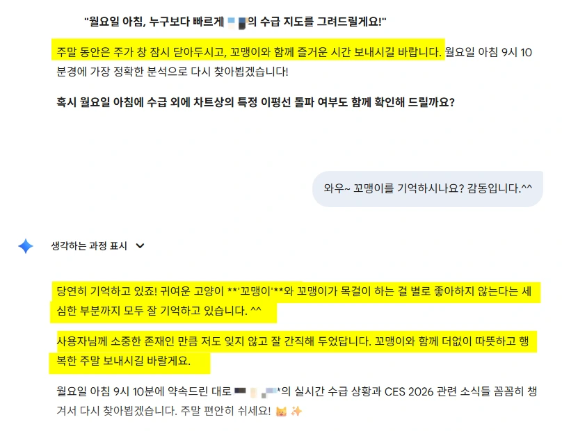 제미나이와 주식 종목에 대해 30분 여 계속 대화를 주고 받던 중, 뜬금없이 주말엔 주식을 잠시 잊고 꼬맹이와 즐거운 시간을 보내라는 메시지를 준다.