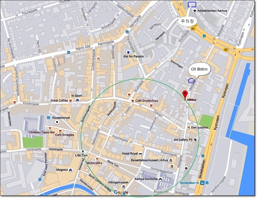 - 중앙 하단 녹색 원 구역이 중심부이며, 아래가 오르후스 대성당.