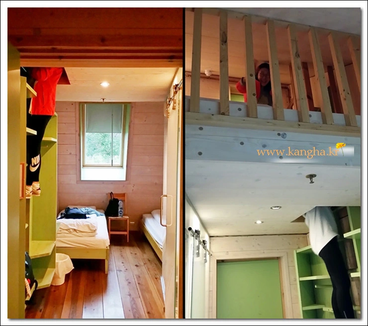 1층에 침대 둘, 그리고 사다리를 통해 올라가는 옥탑방 형태 2층에도 침대가 있다. 당연히 2층이 지연이 몫.