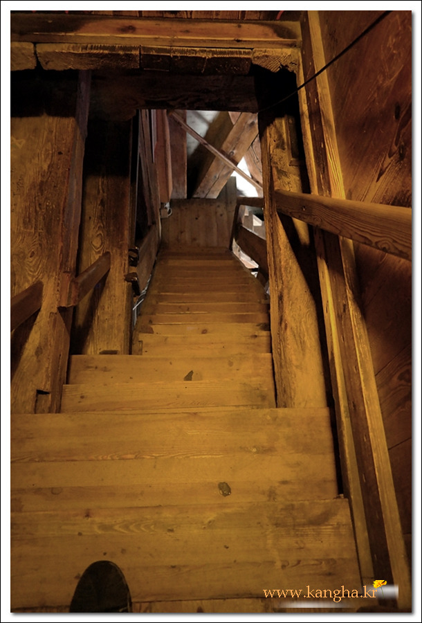 내부 공간이 좁아 사다리와 같은 수직 계단이 시계 반대방향으로 90도로 꺾이면서 올라가는데,