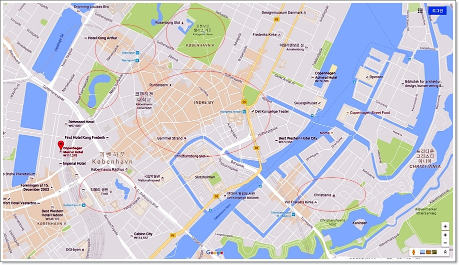 지도 왼쪽 빨간색으로 마킹한 숙소에서 시계 반대방향으로 티볼리 공원 - 구세주 교회 - 크리스티아니아를 지나 [INDRE BY(=도심)]를 거쳐 로센보르 성과 왜르스테드 공원을 보고 숙소로 돌아오면, 코펜하겐 중심의 주요 명소는 다 보는 동선이 된다.