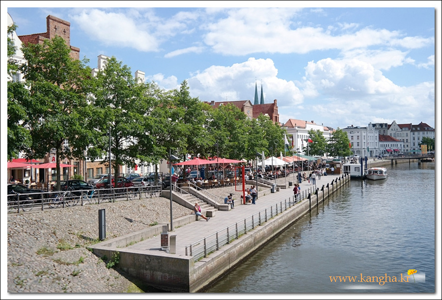Holstentor 박물관을 지나 오른쪽으로 운하를 끼고 오른쪽으로 접어드는 도로를 따라 식당들이 늘어서 있다.
