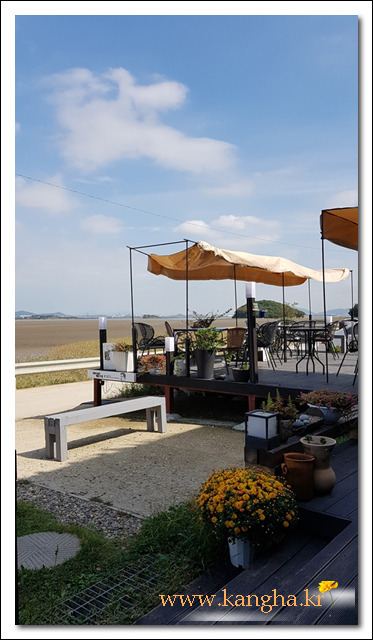 앞은 갯벌인데 오후 5시쯤이면 물이 들어오는 광경도 볼 수 있고, 약 3km 정도의 산책코스도 즐길 수 있다.