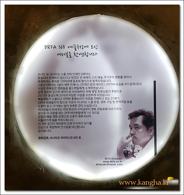 강화도 길상면에 있는 [동검도 DRFA 365 예술극장]은 영화감독 겸 시나리오 라이터인 조나단 유 사장께서 운영하는 1인 다역 시네마 천국이다.
