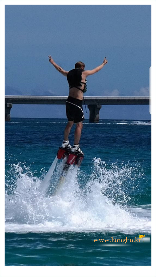 발바닥에 부착한 보드와 연결된 호스를 통해 뿜어 올리는 수압에 의존하여 수면 위로 부상(浮上)하는 건데,