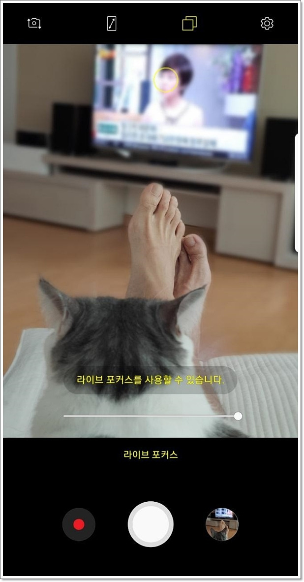 촬영모드에서 [라이브 포커스]를 터치하면 피사체가 클로즈업 되며 배경흐림의 농도를 조절하는 바(bar)가 나타난다.